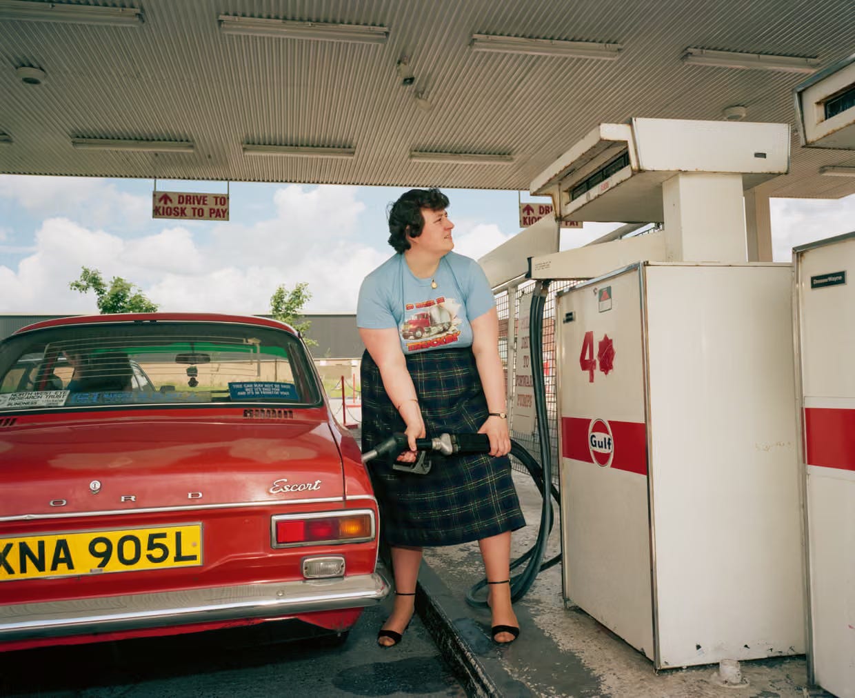I include this early photograph as a benchmark. Much has changed since then. I mention this seemingly obvious point because it reveals a lot about his documentary approach. He captures seemingly trivial scenes — a woman filling a car with petrol for Something That Seems Ordinary, Salford, England, 1986 — but time has transformed her into a person from a foreign land. She wears a rectangular below-the-knee tartan skirt, stands with her feet far apart, and lugs a petrol nozzle with both arms that hang heavy like concrete. Her face is in profile, eyes focused on watching the numbers climb. The Ford Escort is from another era — chrome finish and a bulging hood, while the pump itself resembles the robot Wall-E.