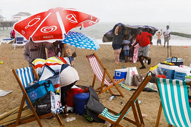 The visual vocabulary of Britain is at his fingertips because he has spent a career defining his relationship to his country through photography. Think of England (2004) is a photobook dedicated to this pursuit. Arguably, the best place to capture Britishness is on a rainy beach. Parr explains that rain and wind make people do funny things, and he is correct. Beachgoers in Clacton-on-Sea, Essex, 2017, engage in a slow-motion battle scene. A man prances from a blanket base to an umbrella fort that appears to be sponsored by Wall’s ice cream. Hands hold up the protective gear with utmost sincerity. Water bottles strewn about, flapping deck chairs, and closed coolers signal an abandoned picnic.