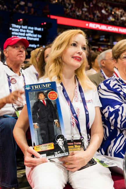 Seriousness belies the humour. Parr describes himself as being in the entertainment industry, but politics can be inferred from his work if the viewer so chooses. Unlike some of his contemporaries featured alongside Parr in The 80s: Photographing Britain (21 November 2024 - 5 May 2025) at Tate Britain, the judgment or political stance of his images is less glaring. Take his photographs from the 2016 Republican Convention in Cleveland, Ohio. The blonde subject appears almost biblical in her fondling of a Trump doll. Adoration is reminiscent of Madonna with a baby in her arms; the only thing missing is a nimbus.